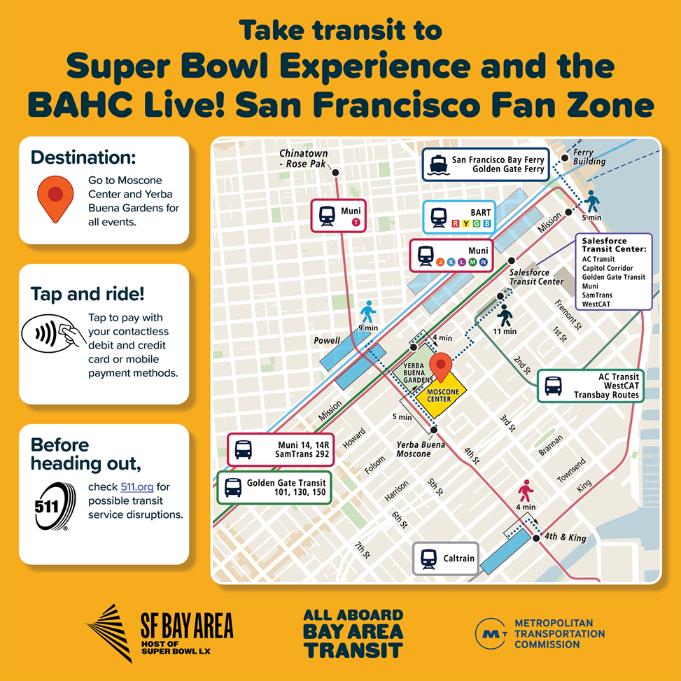 Bay Area transit agencies and the Metropolitan Transportation Commission encourage residents and visitors alike to take transit to Super Bowl LX at Levi’s Stadium in Santa Clara on Sunday, Feb. 8, and to related events happening around the region.