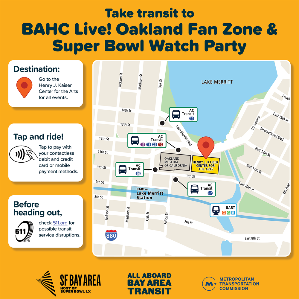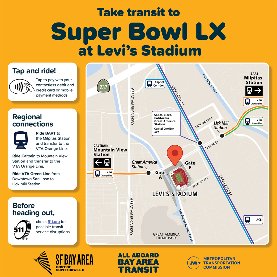 Bay Area transit agencies and the Metropolitan Transportation Commission encourage residents and visitors alike to take transit to Super Bowl LX at Levi’s Stadium in Santa Clara on Sunday, Feb. 8, and to related events happening around the region.